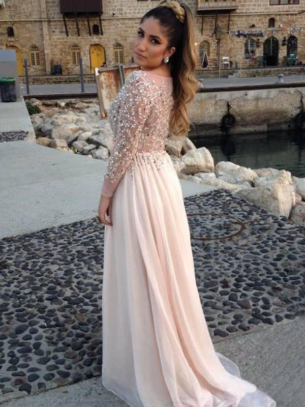 ombre prom dresses,Ivory A-line Bateau Long Sleeve Chiffon Prom Dresses Evening Dresses 1210