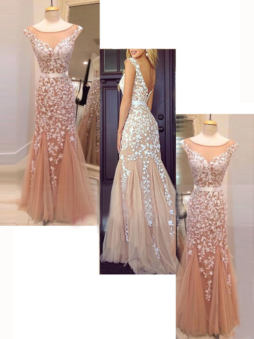 prom dresses strapless,Champagne Trumpet/Mermaid Scoop Sleeveless Tulle Prom Dresses Evening Dresses 223