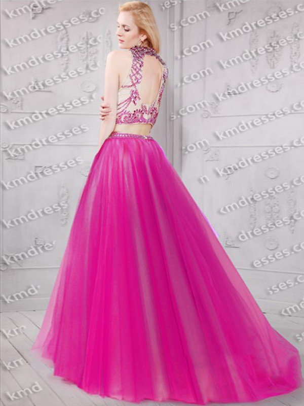 prom dresses two pieces,A-line High Neck Floor-length Tulle Prom Dresses Evening Dresses 6112