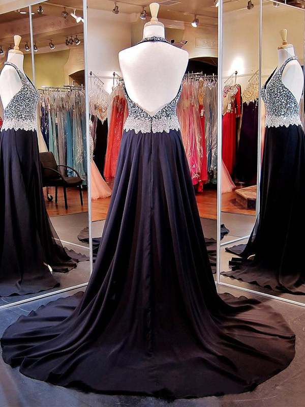 navy prom dresses,Dark Navy A-line Halter Chiffon Prom Dresses Evening Dresses 8676