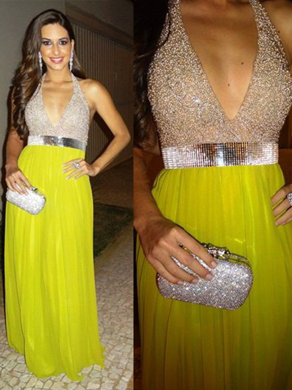 yellow prom dresses,Daffodil A-line Halter Rhinestone Prom Dresses Evening Dresses 056