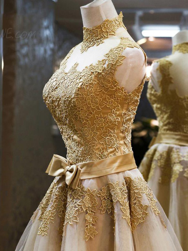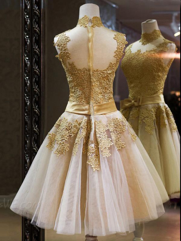 2016 prom dresses,Gold A-line High Neck Organza Appliques Short Prom Dresses Homecoming Dresses 034