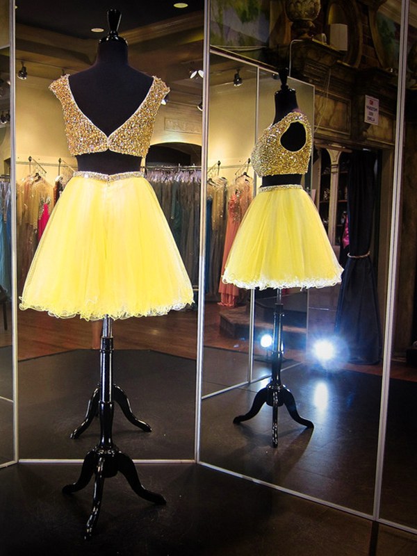 unique prom dresses,Yellow A-line Scoop Short Sleeve Short/Mini Tulle Homecoming Dresses/Short Prom Dresses 1444