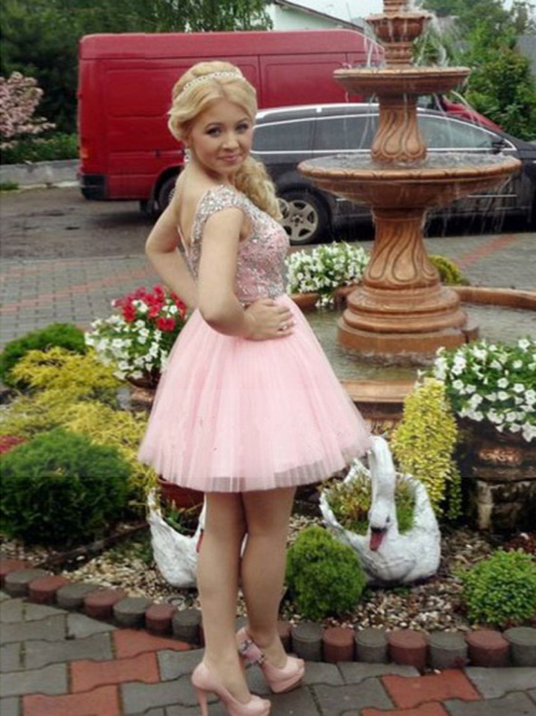 sparkly prom dresses,Pink A-line Scoop Short Mini Tulle Homecoming Dresses Cocktail Dresses 097
