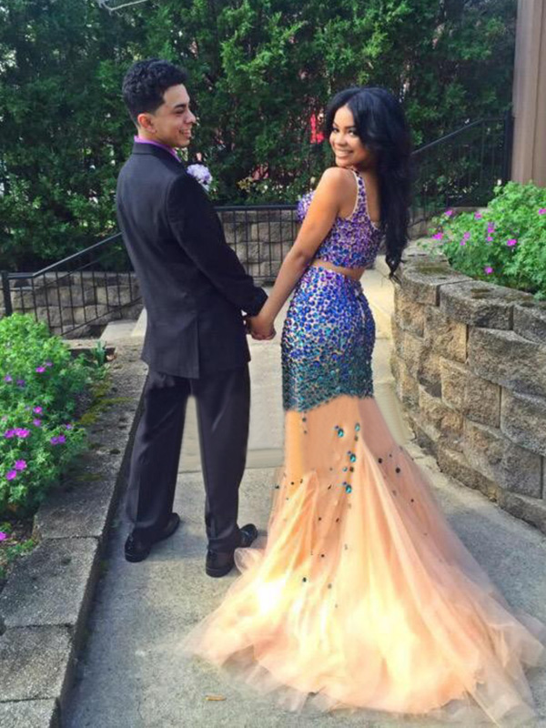2 pieces prom dresses,Colorful Trumpet/Mermaid Straps Rhinestones Floor-length Tulle Prom Dresses Evening Dresses 8762