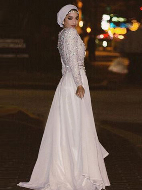 prom dresses with full sleeve,Light Grey A-line Scoop Floor-length Chiffon Prom Dresses Evening Dresses 8782