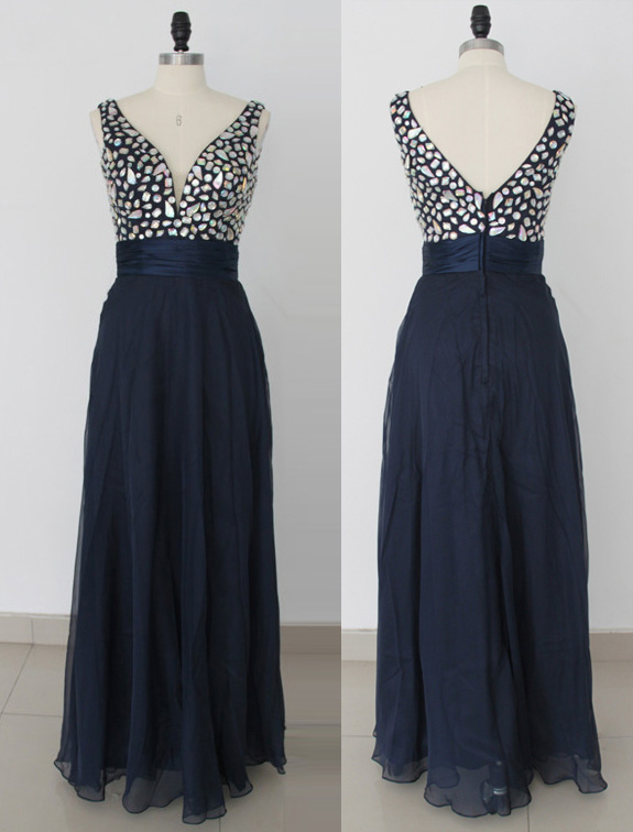 vestidos prom dresses,Dark Navy A-line V-neck Floor-length Chiffon Prom Dresses Evening Dresses 090