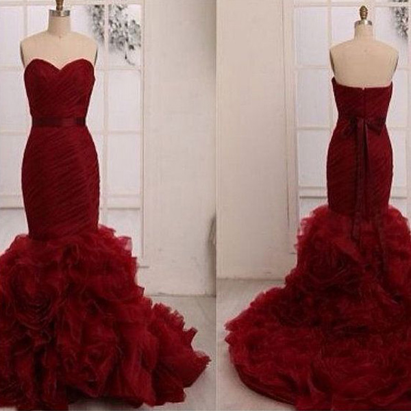 burgundy prom dresses,Burgundy Trumpet Mermaid Sweetheart Sweep Brush Train Tulle Evening Dress Prom Dresses 9649