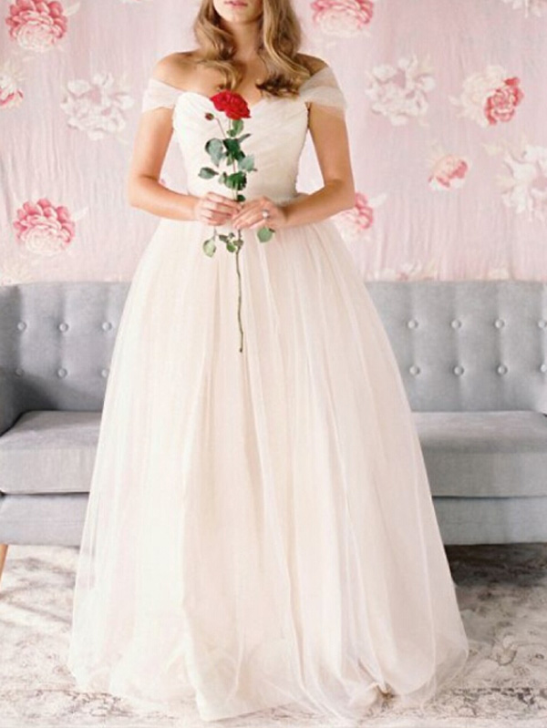 white prom dresses,White A-line Off-the-shoulder Floor-length Tulle Evening Dress Prom Dresses 9668