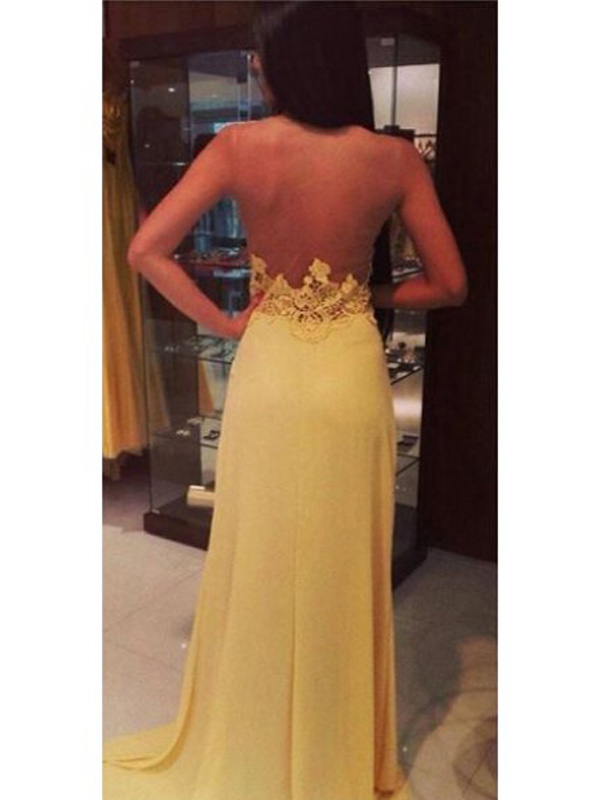 yellow prom dresses,Daffodil A-line Scoop Sweep Brush Train Chiffon Evening Dress Prom Dresses 9888