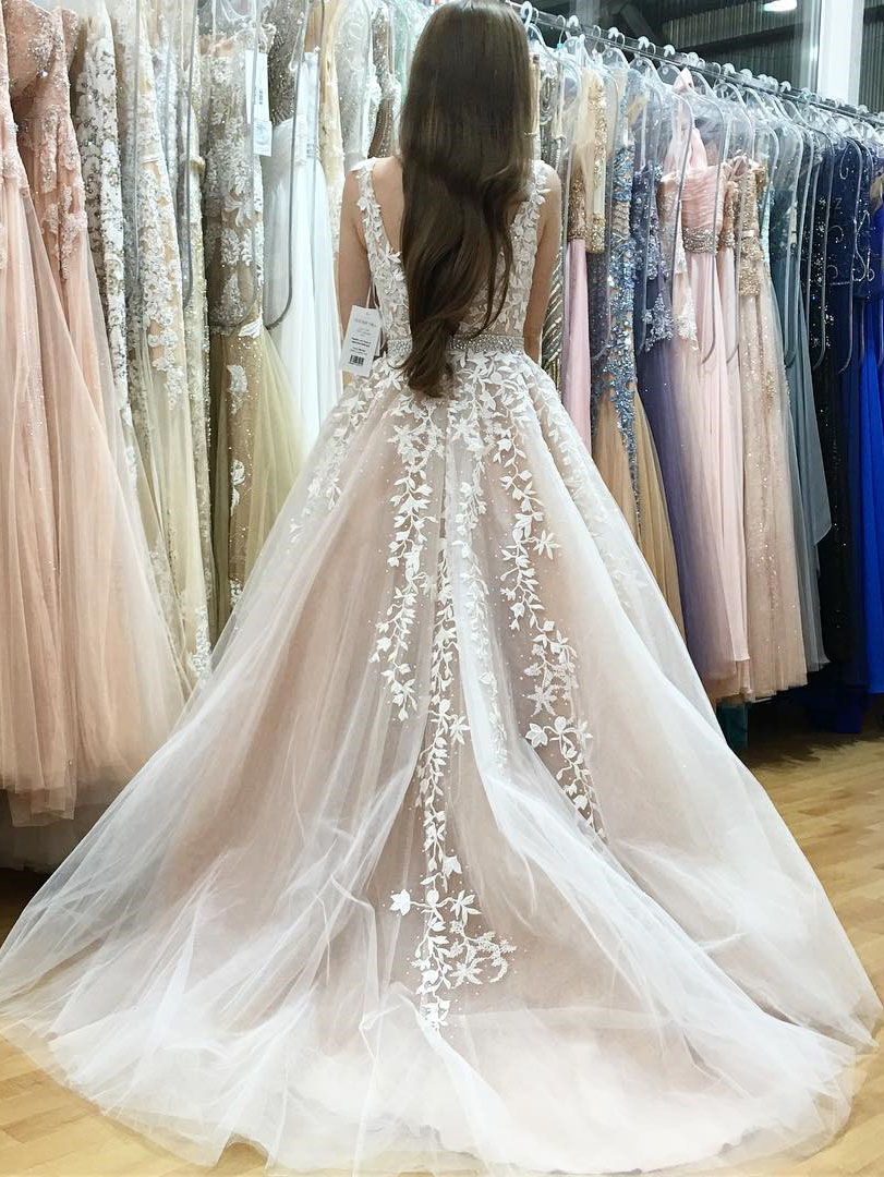 prom dresses with Appliques, A-line V-neck Floor-length Tulle Evening Dress Prom Dresses SKY235